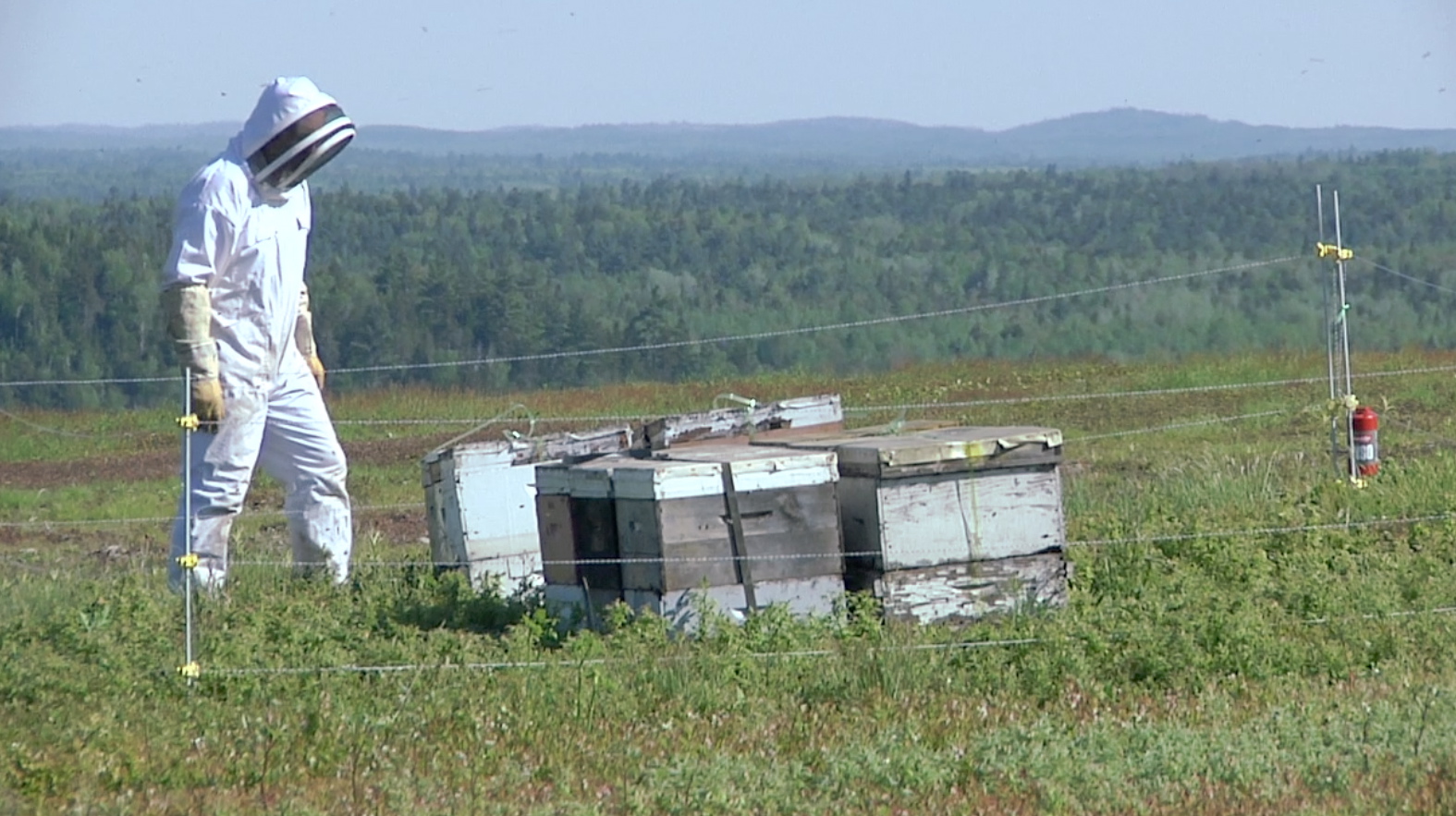 Above, Geoff Leighton navigates barrens in Cherryfield, Maine this spring, protected from the hives’ active bees. Land owners in the Down East area import over 60,000 hives to pollinate their wild blueberry crops. Photo by Anita Clearfield.