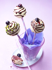- Mix the cake in a blender until only crumbs are left. Add 3 tbsp. of blueberry juice to the cream cheese and stir in the cake crumbs. Knead until dough is formed. Let it cool for 30 min. Melt the couverture over hot water (max. 40°C). Form small balls out of the cool dough. Dip the lollypop sticks into the couverture and put them into the balls. Then place them into the refrigerator for 30 min.
