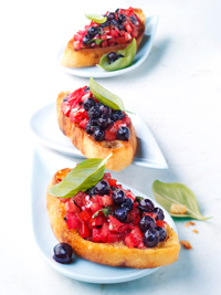 Evenly spread tomato-blueberry mixture over the bread slices. Garnish with remaining basil and serve.
