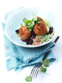 Place meatballs next to or on top of cucumber salad and garnish with parsley. Serves 8.