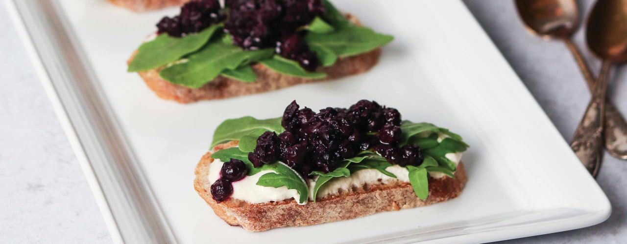 - To assemble, spread each crostini with a teaspoon of cashew crema, a few leaves of arugula, and a teaspoon of Wild Blueberry relish.