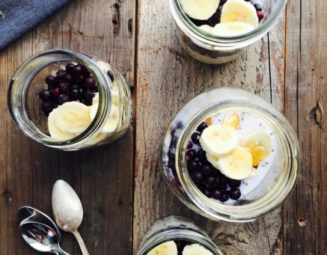 - Place the oats, chia seeds and salt in a bowl. Add about ½ cup of the mixture to each of 4 Mason jars or other lidded containers.