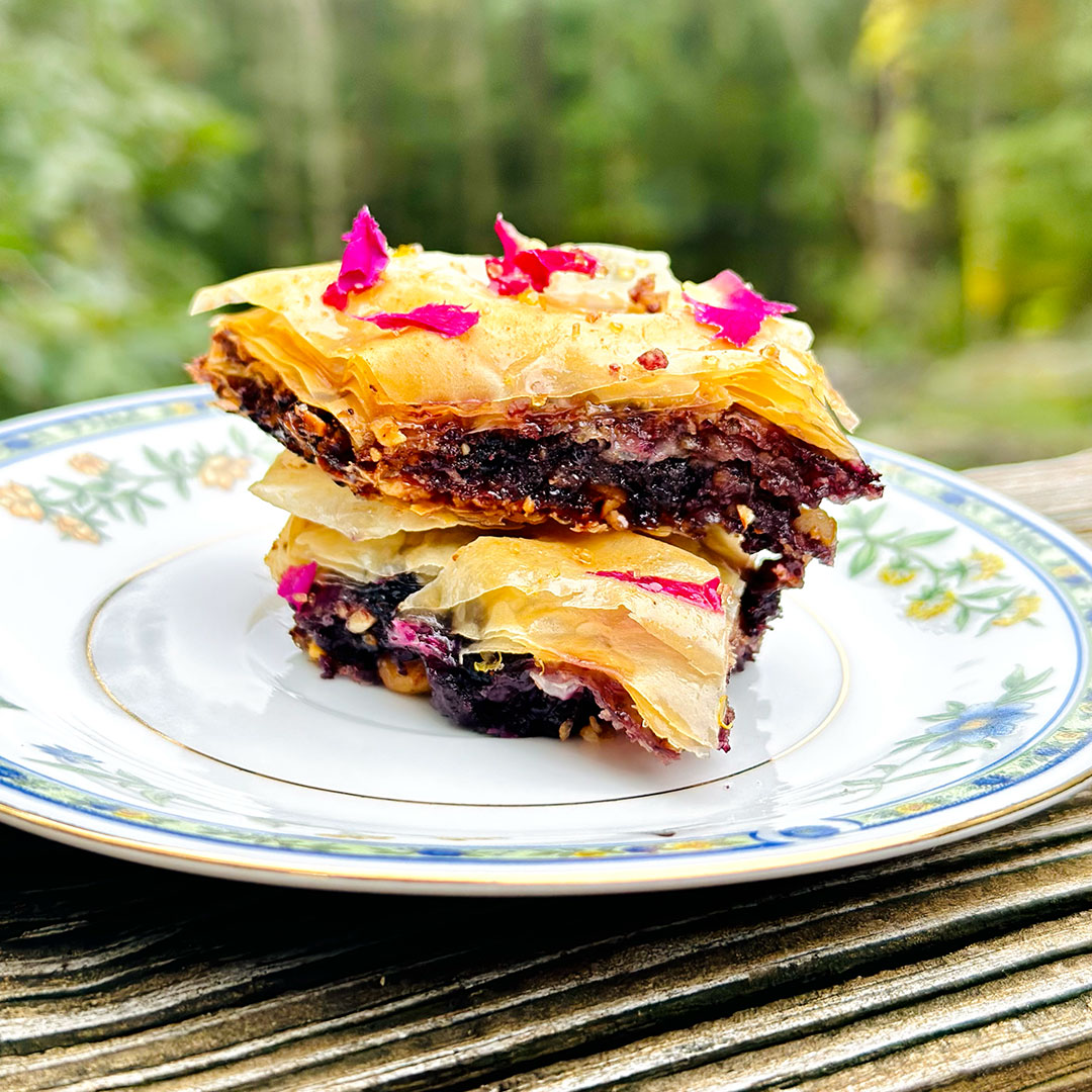 - When the baklava is fully baked, evenly drench it in baklava syrup mixture. Then, sprinkle with dried edible flowers and other garnishes of your choosing. Allow it to fully cool to room temperature, about 1 hour, then serve.