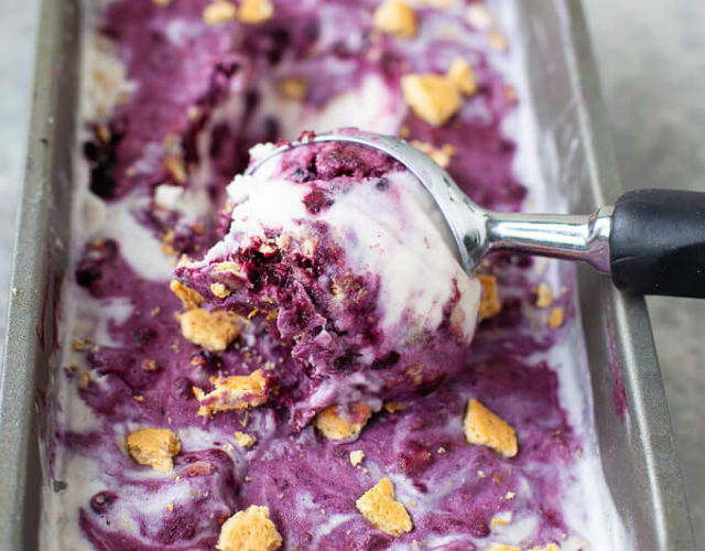 If you have don’t have an ice cream maker, transfer coconut milk mixture to a large freezer-safe bowl. Freeze for 30 minutes and take it out to whisk briskly or blend using an immersion blender Repeat this every 30 minutes until your ice cream starts to turn creamy. Fold in Wild Blueberries and graham crackers and continue to repeat until ice cream is frozen through.