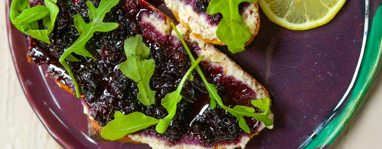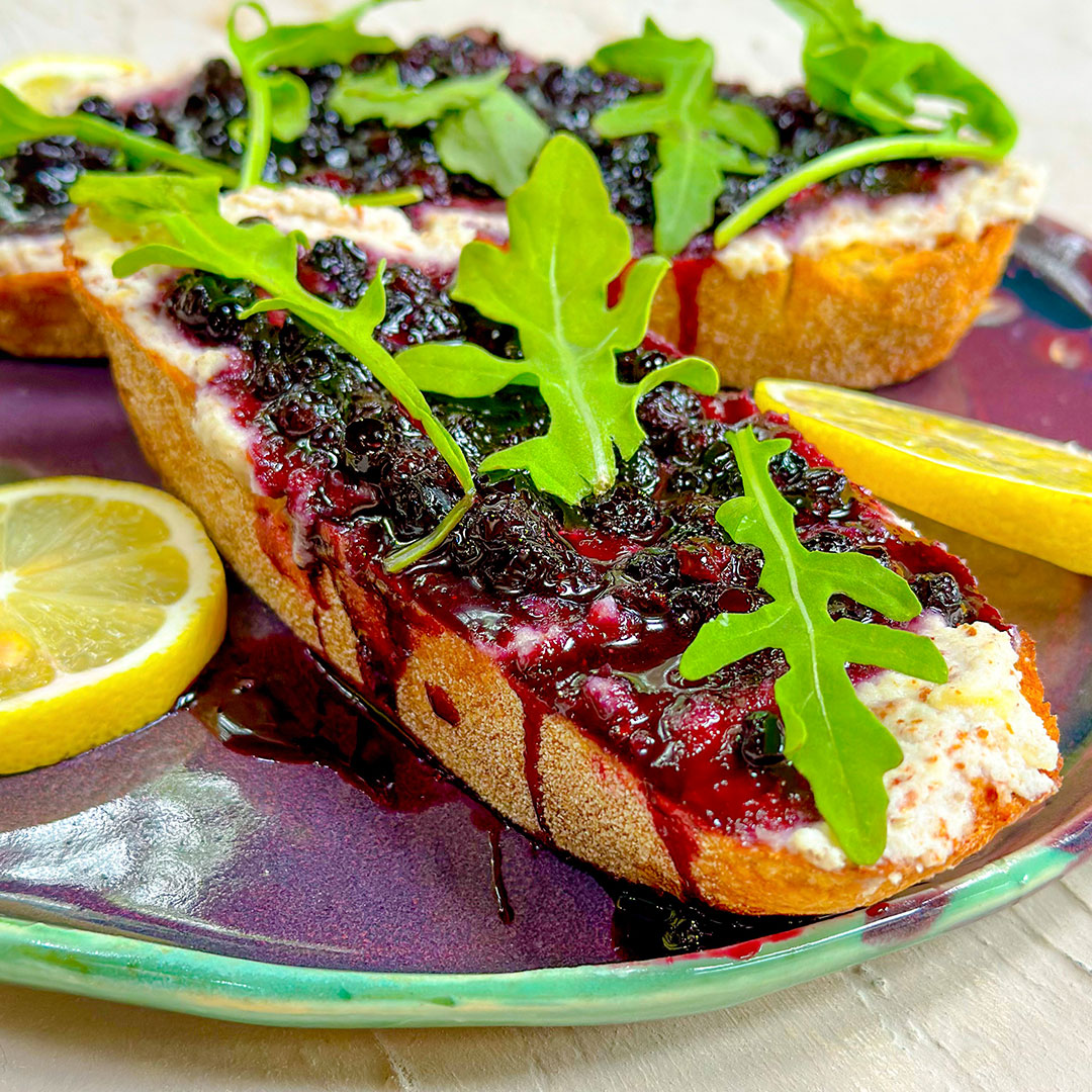 Wild Blueberry Grilled Sourdough with Cashew Ricotta, Blueberry Compote, Arugula