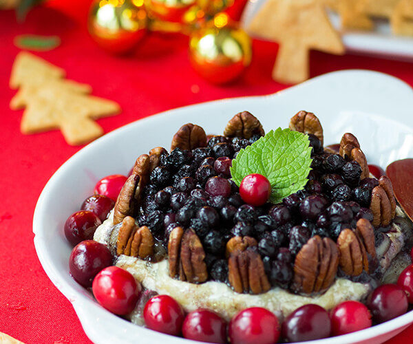 - Combine the blueberries, sugar, spices, and salt. Pour the blueberry mixture over the brie and bake in the bottom third of the oven for 30 minutes until the cheese starts to bubble around the edges.