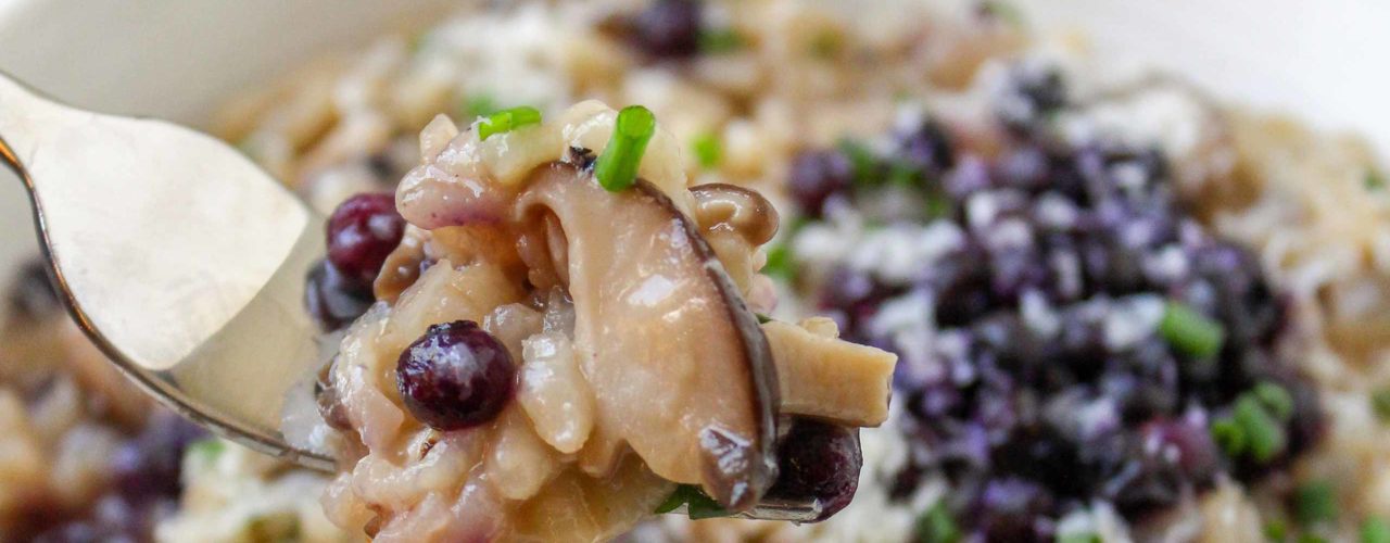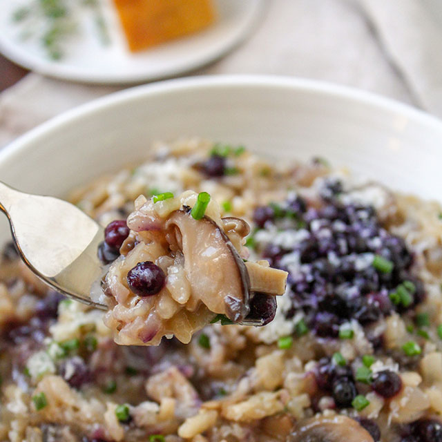Note: Rinsing the Wild Blueberries in a strainer until the water runs clear prevents your risotto from turning blue when you stir them in.