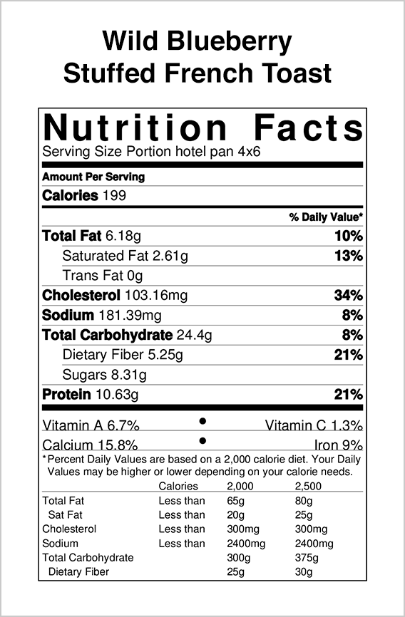 3.Dip remaining half the bread in egg mixture, place as top layer. Pour remaining egg mixture over the pan evenly. Bake covered at 325'F convection oven 20 minutes, then uncover for 20 more minutes until golden brown and internal temperature of 145'F. Portion the hotel pan 4x6, serve with a sprinkle of confectionary sugar - no syrup required!
